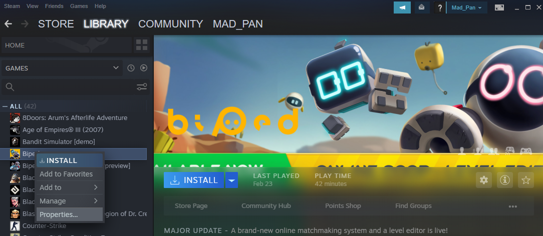 1. Go to your library and find Biped; 2. Right-click on the game and select "Properties";