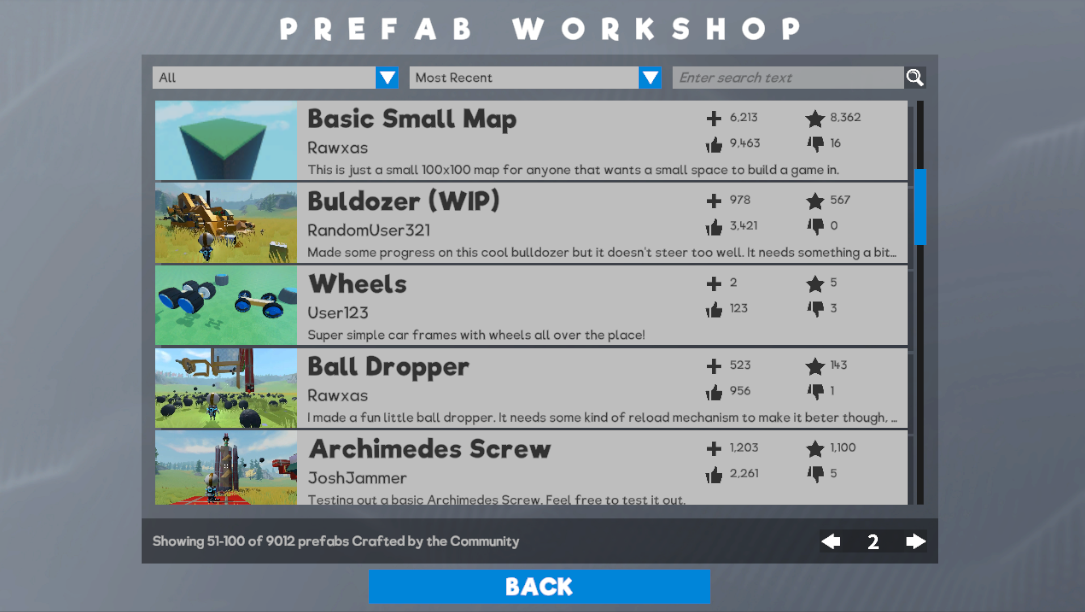 The Prefab Workshop will allow crafters to share their various creations that aren’t quite games in a slightly different way. Publishing a save as a “Prefab” will allow other crafters to go in and “view” them (rather than play). If they like what they see, then they can copy this Prefab to their own local saves and start building with/onto it. Prefabs are essentially “open source” creations, so make sure you only publish Prefabs that you are willing to share, and if you use one, make sure you give credit.