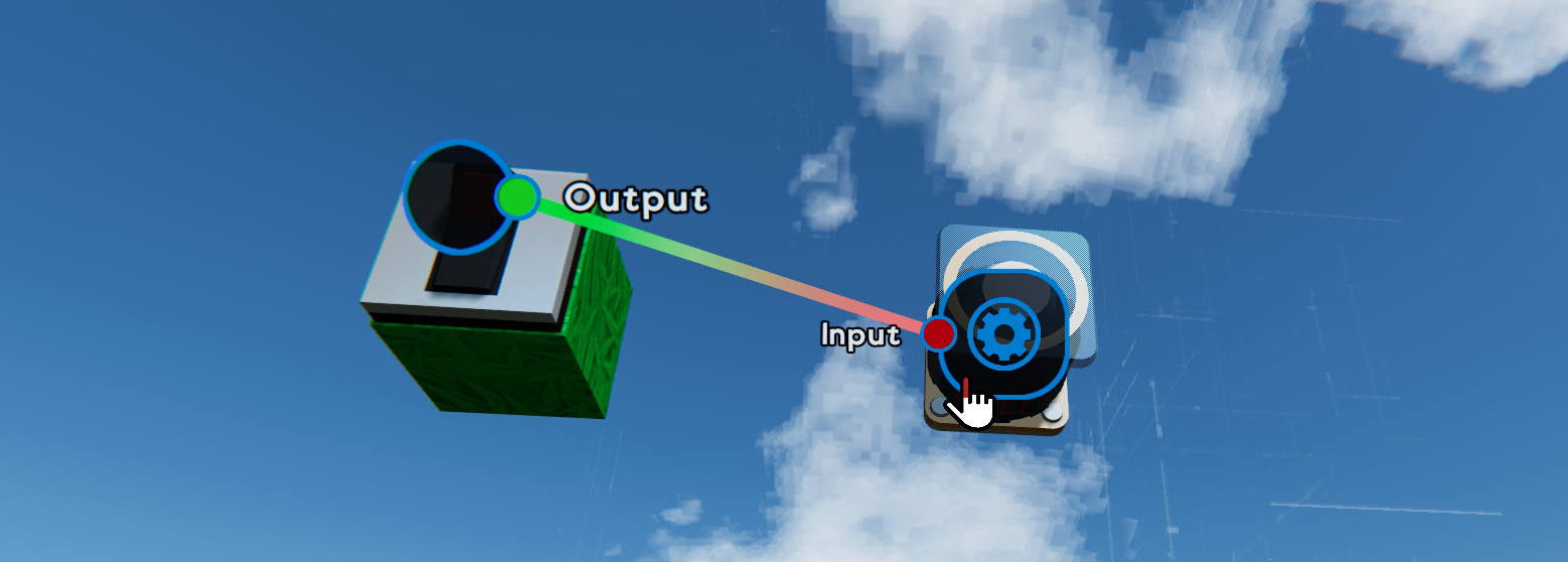 The wiring system lets you connect parts in the same way as before, but with a lot of improvements and nice extras. Instead of assigning a “channel” to each of your motorised parts and controllers, you will now be connecting them through virtual wires. After you’ve placed a part (we’ll use a Motor and a Switch in this example), simply hover over the Motor and you’ll see a small blue button. Put your crosshair over it and click LMB and you’ll see an “Input” button. From here you simply click on the little “port” and start dragging a wire between two parts. Drag this wire over the Switch and it will automatically expand the little blue circle and display an “Output” button. Click on this “port” to finish the connection and voila! These parts are now connected as if they were both set to “channel 01”.