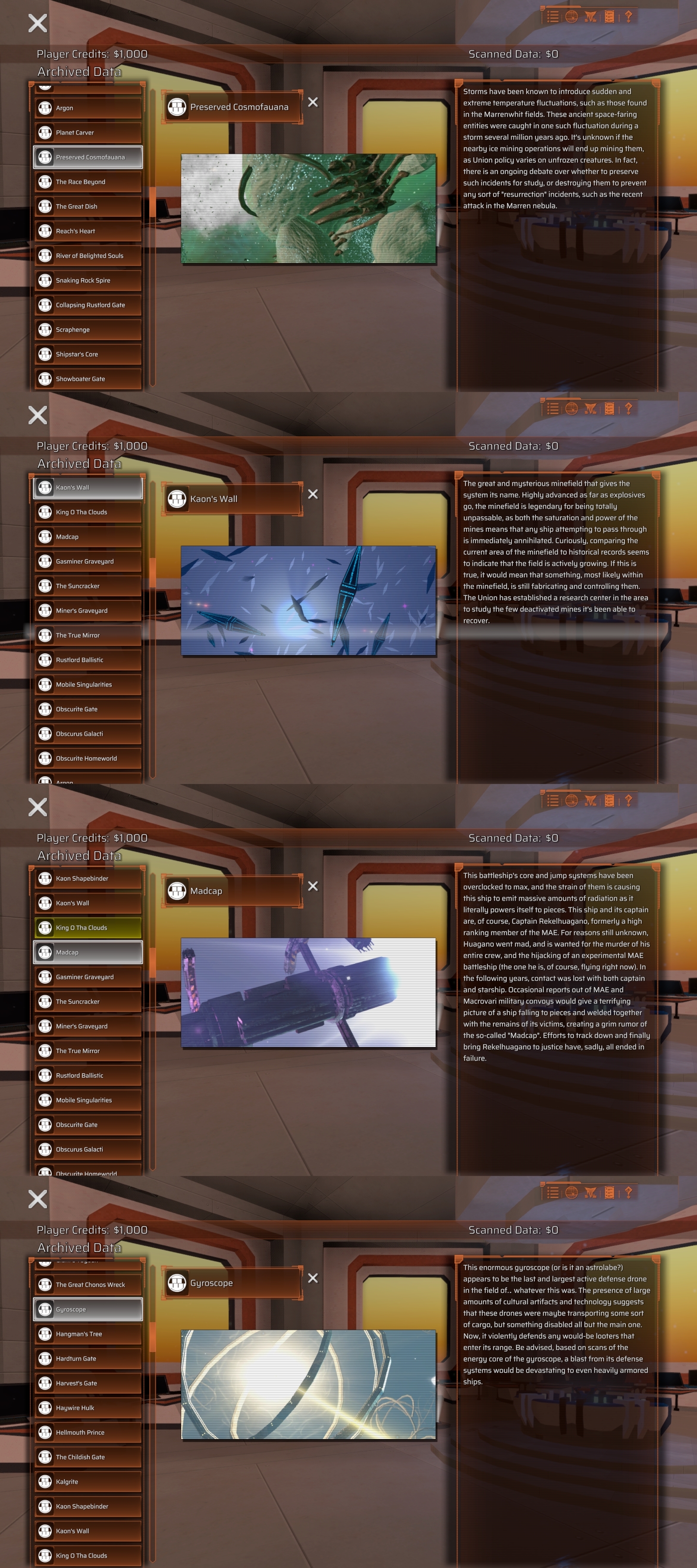 Not only that, every point of interest that can be scanned can now, in fact, be scanned, and we’ve written up the lore and flavor text for all of them. You can see this flavor text by selling you scanned data to any data center, which has had some UI improvements, with new animations and graphics.