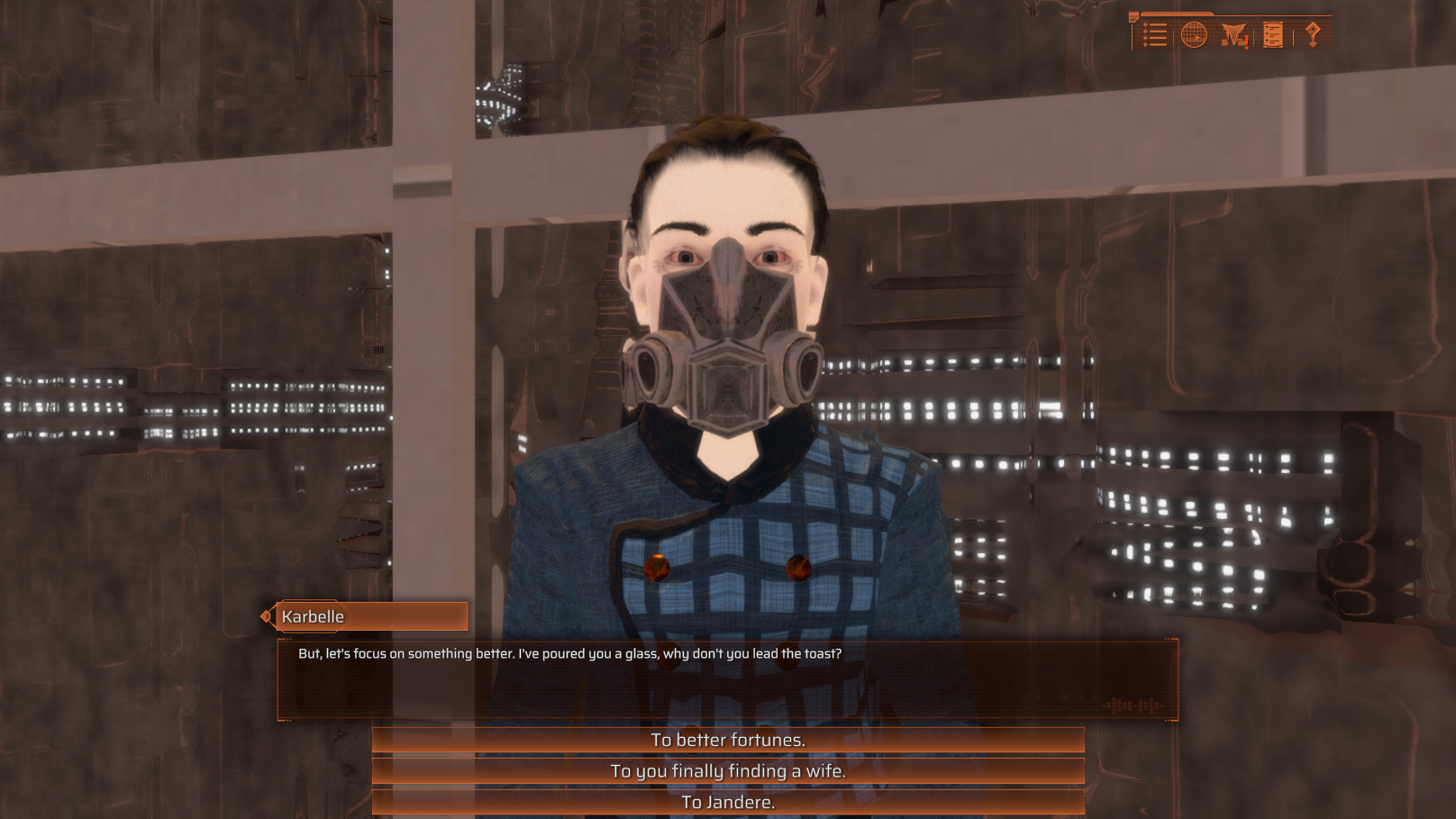 A lot of the game’s various sidequests are written up now, but implementation lags behind a bit. The major one implemented this month was a small early game questline where you’re able to get drinks with your lawyer (and only friend), Karbelle.