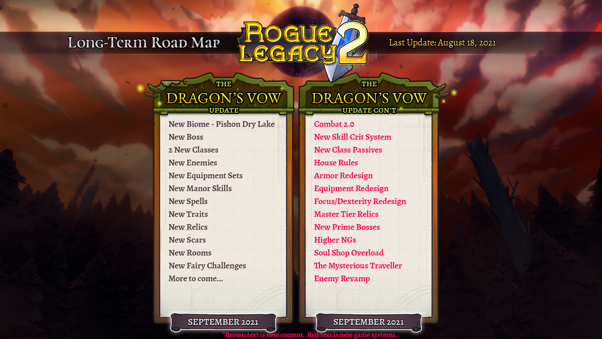 Today marks one year since the release of Rogue Legacy 2 in Early Access, and we’re heralding this milestone with another update to the roadmap. We originally planned to make the next update smaller and come out sooner, but our ambitions got the better of us and we are once again preparing big things. With a focus on balance and accessibility, the Dragon’s Vow update is on-track to come out in mid-to-late September.
