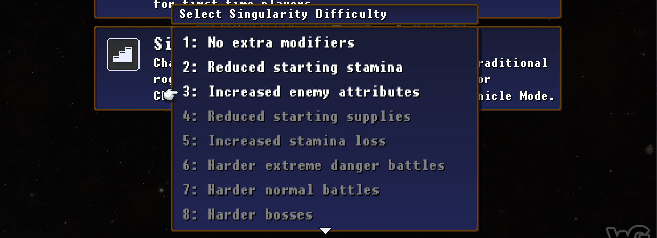 As you win runs in Singularity Mode, additional difficulty modifiers will open up, making for more challenging runs. Winning more challenging difficulties will provide more Chronicle Mode rewards, and of course there are achievements to be earned.