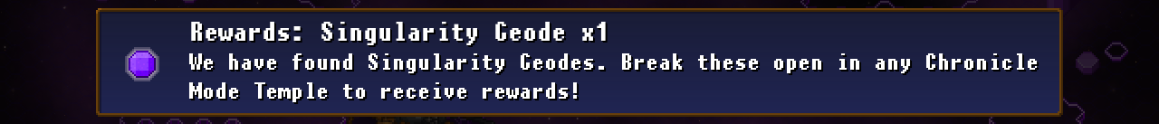 Playing Singularity Mode will award you Singularity Geodes, which can be cracked open in any Chronicle Mode temple to receive random loot. This can be books, relics, particles, or soul gems. Winning will grant you more geodes, but even if you lose your run, you'll still get at least one.