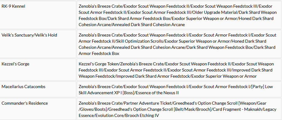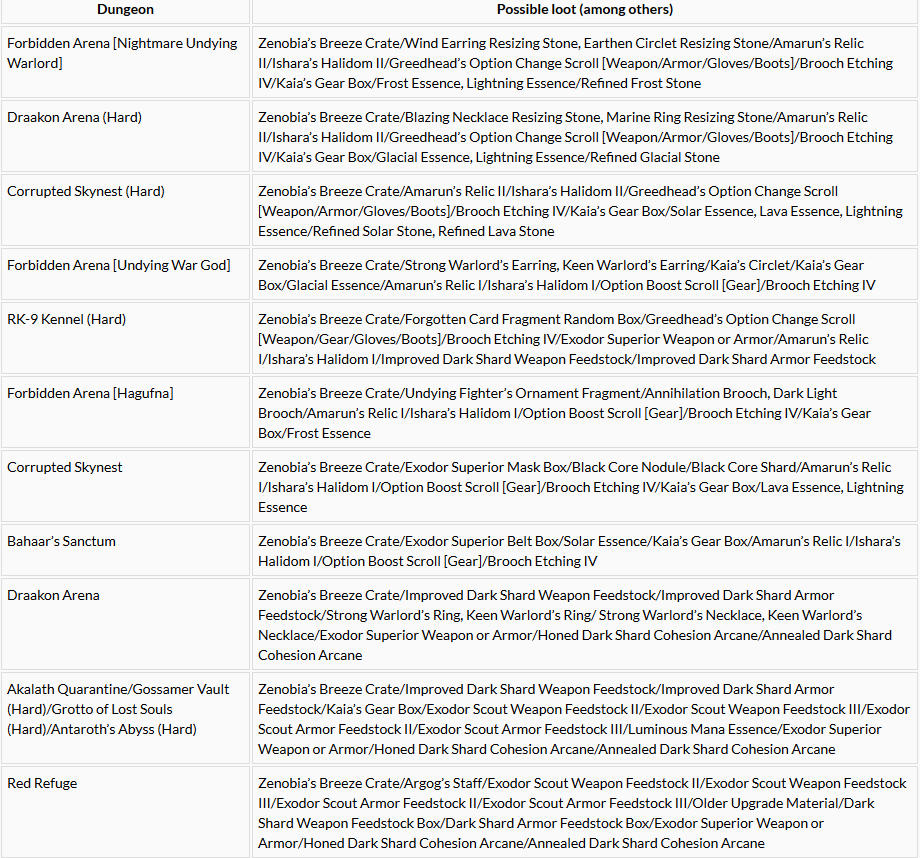 **Possible Loot Includes:** * Zenobia’s Sacred Breath Box * Forgotten Card Fragment Random Box * Various Greedhead’s Option Change Scrolls * Various brooch etchings * Various materials for crafting etchings * Superior Exodor weapon and armor * Ishara’s Halidom I, Amarun’s Relic I * Magical Dark Shard Armor and Weapon Feedstock