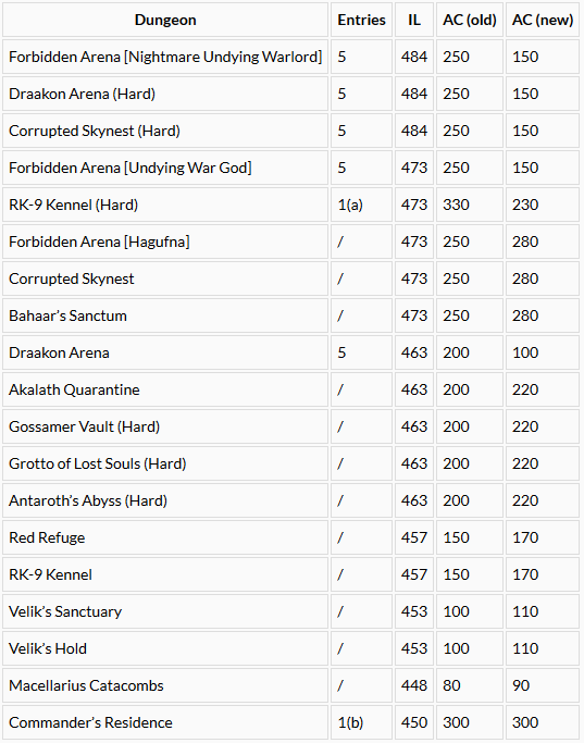 Key: IL = Item Level AC = Adventure Coins (a) RK-9 Kennel (Hard) has a daily entry limit. (b) Commander’s Residence is still only accessible on weekends.