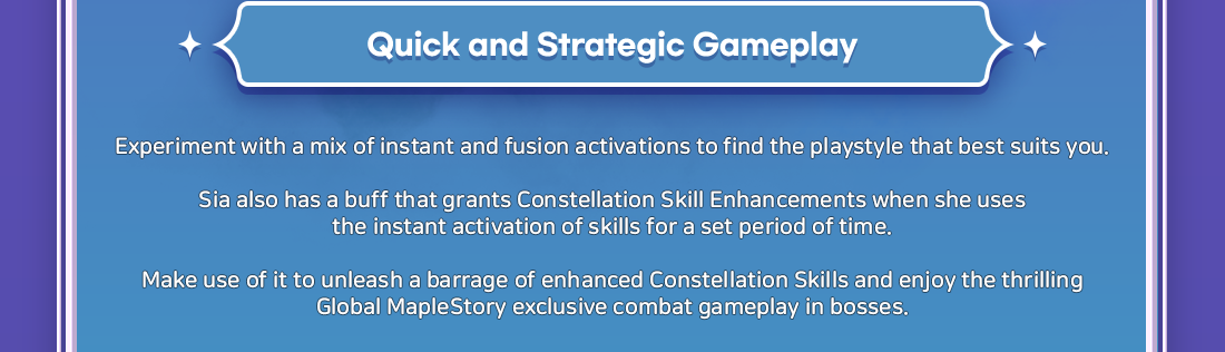 Call upon the power of the 12 constellations and unleash her magic as you adventure throughout MapleStory. Learn more on the Sia Astelle Classes & Jobs page, or take a look at the Introducing Sia Astelle post for more info on how her arsenal of powers have changed from MapleStory M!