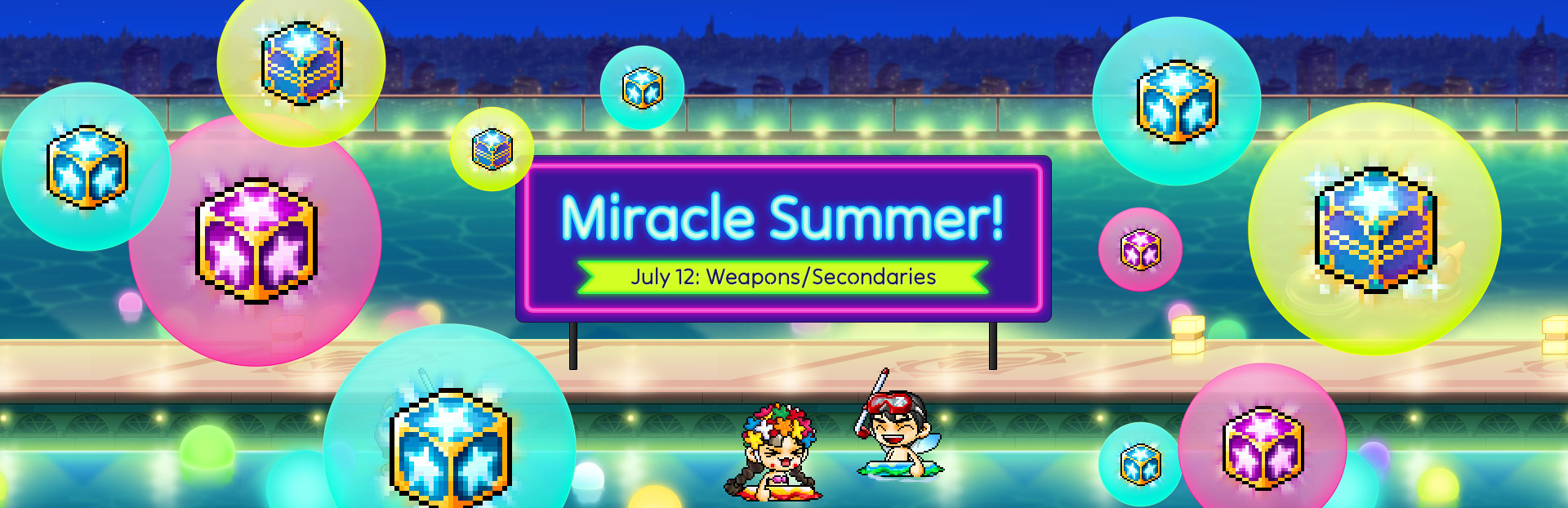 This Saturday, July 12, 2025, Maplers on all Worlds will have Miracle Time enabled for Primary Weapons and Secondary Equipment! Cube all forms of primary weapons, including swords, bows, guns, chakrams, wands, and more, as well as the secondary equipment, such as shields, rosaries, whistles, hex seekers, and more, all-day Saturday with the improved Rank-Up chances!