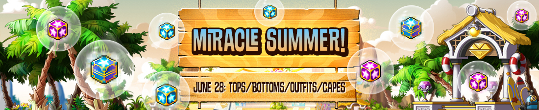 This Saturday, June 28, 2025, Maplers on all Worlds will have Miracle Time enabled for Tops, Bottoms, Outfits, and Cape Equipment! Cube your shirts, breastplates, and blouses, your shorts, skirts, and greaves, your robes, dresses, and trenchcoats, and even your cloaks, backpacks, and capes of all sorts, all-day Saturday with the improved Rank-Up chances!