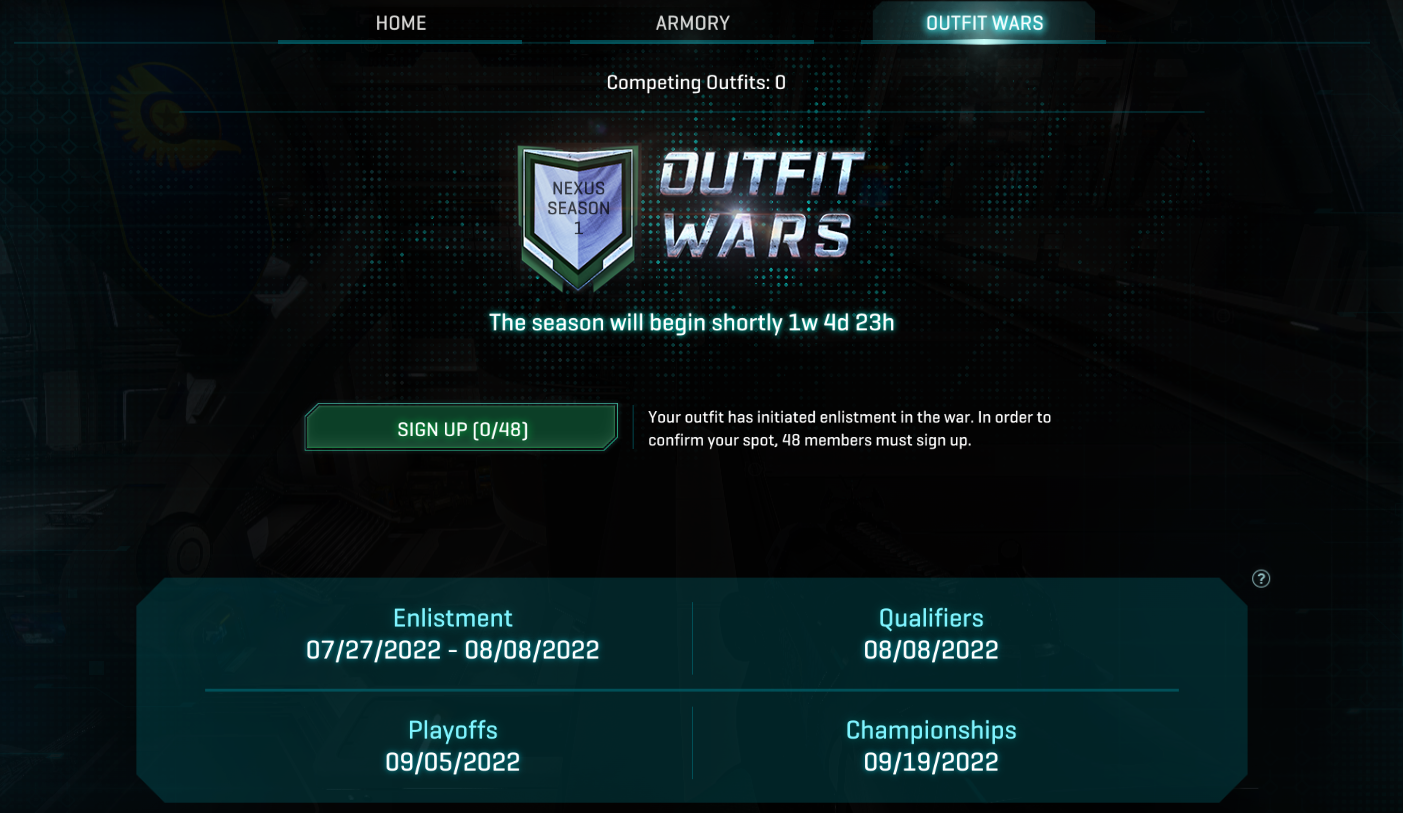 Enlistment for this season's Outfit War event runs from Aug. 03 - Aug. 14. You must have at least 48 players in your Outfit in order to sign up, and 48 players must sign up individually to confirm your Outfit's participation in the event.