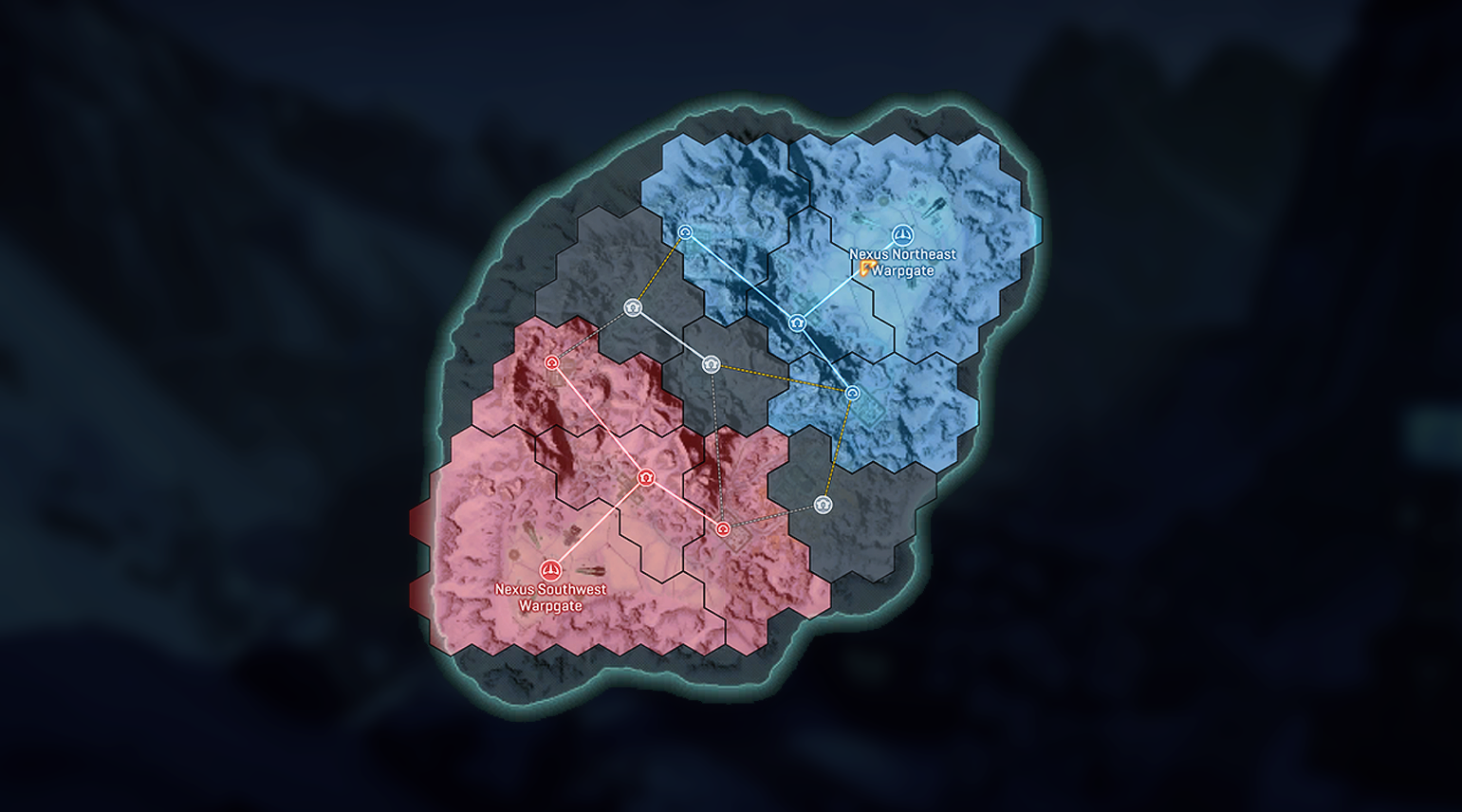 The snowy battleground of Nexus is divided into two Warpgates and nine bases. The three center bases begin neutral, and the three bases nearest each Warpgate begin owned by their respective faction.