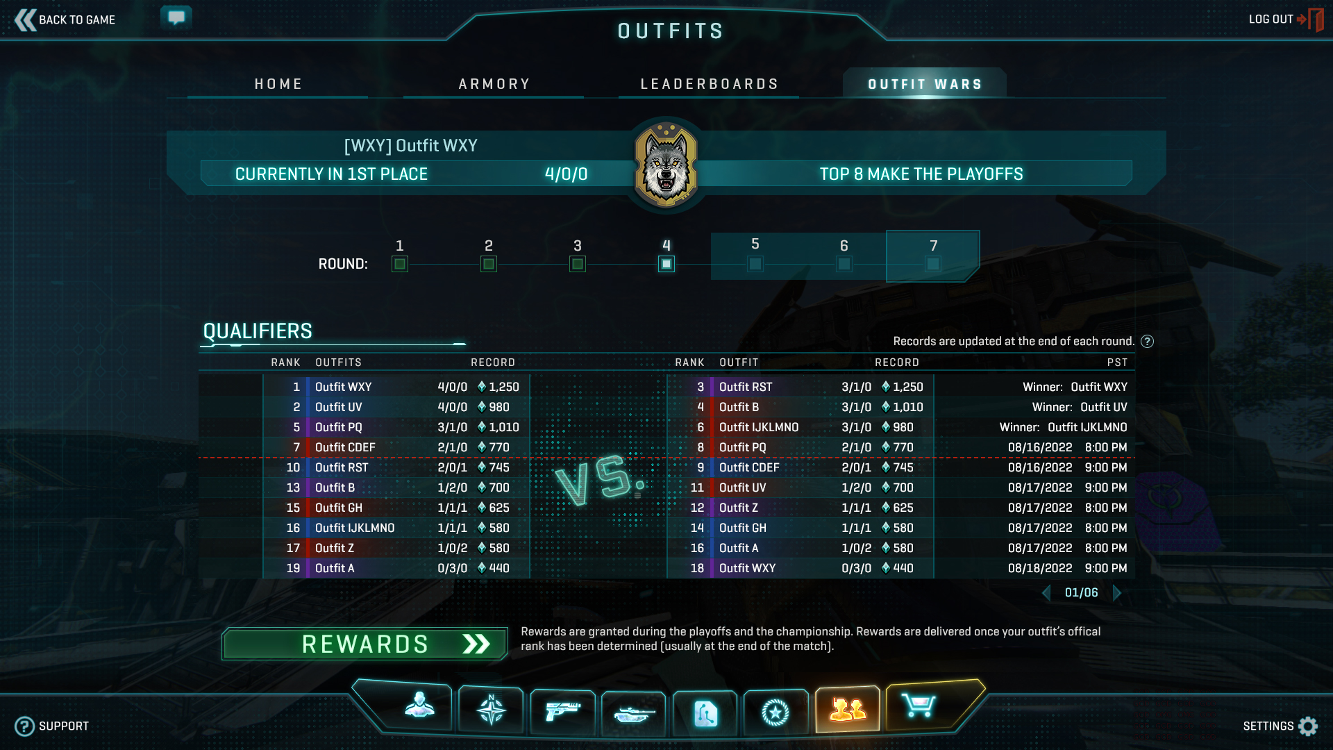 Championships - When the final Playoffs match is complete, their scores will determine the Gold/Silver and Bronze/Fourth place matchups. Placement in this last match determines the final winners in the Outfit Wars season. Championship games will take place exclusively on Saturday, with the Bronze/Fourth place battle starting at 12pm server time and the Silver/Gold matchup at 12:30pm server time.