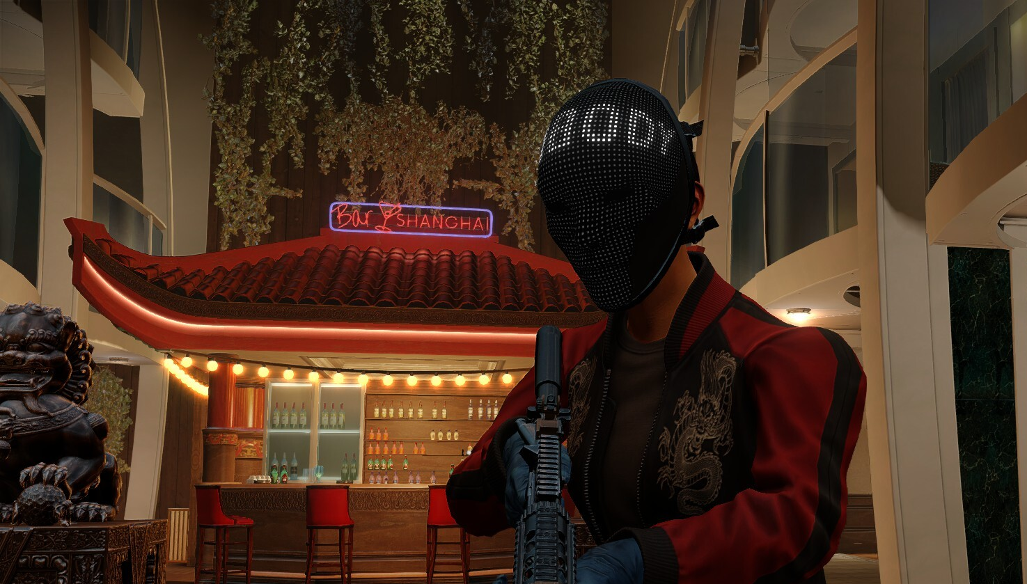 Joy wearing the Dragon Bomber Red suit waiting for the winch in the Black Cat heist
