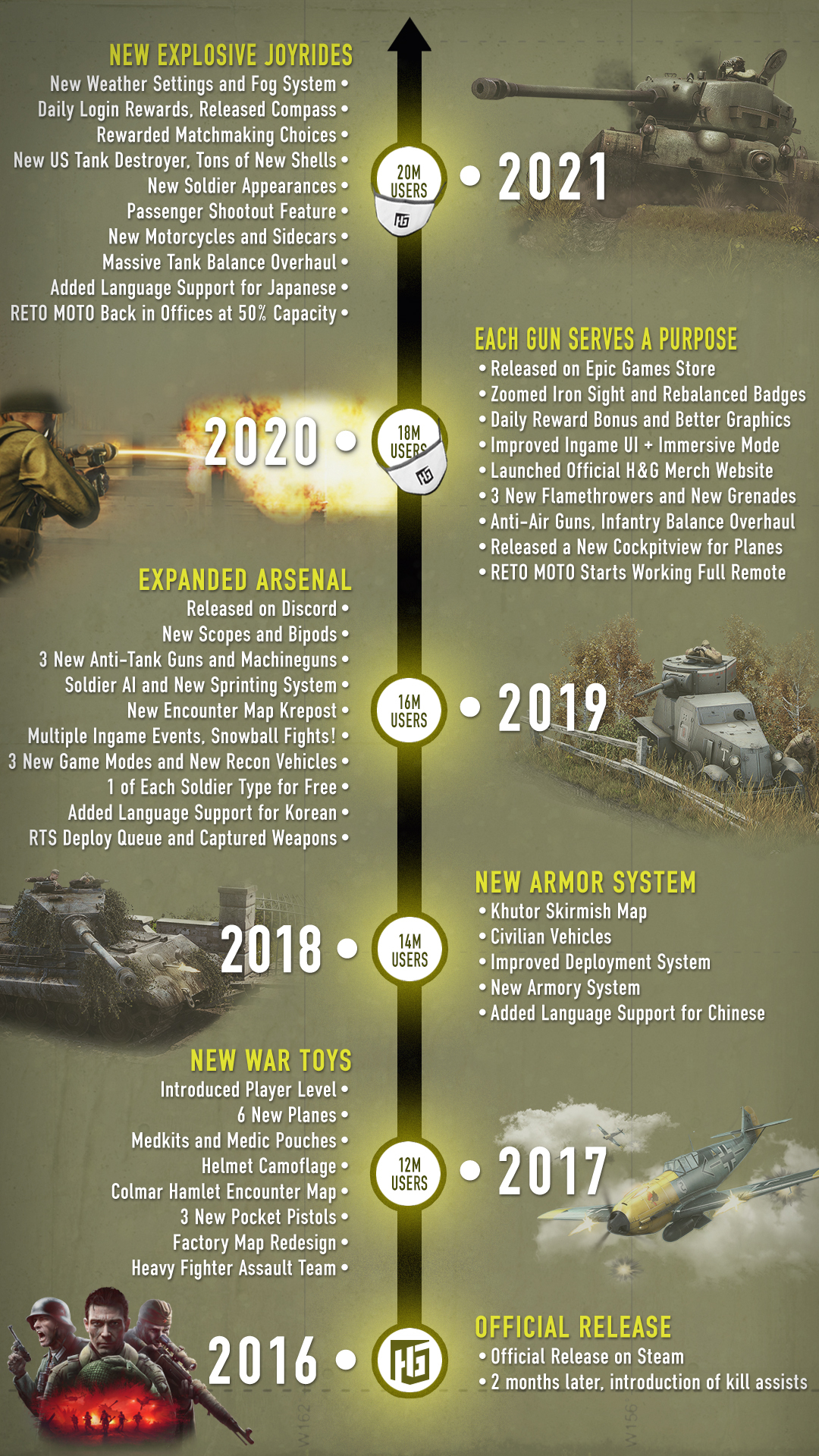 For over 5 years our game and community kept evolving, millions of new players from around the globe have come together through our continued expansion of supported languages and distribution platforms, many updates, exciting features, bad-ass new weapons and mean war machines taking the shapes of planes, tanks and terrain vehicles.