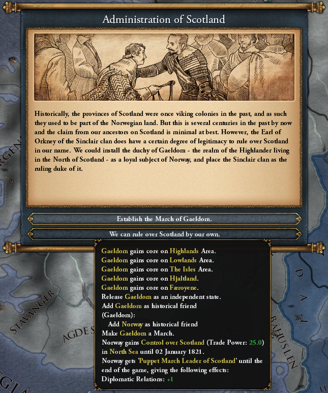 While the main missions are all about reversing the flow of history and subjugating Denmark, there is also a reference to the Scottish Sinclar clan which swore loyalty to the Norwegian crown with the mission “The Claims of Orkney”. Completing it by conquering Scotland will fire this event:
