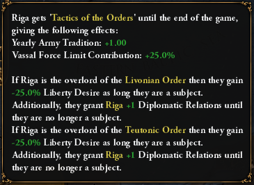 After getting rid of all the small bishoprics and finishing the mission “Protect Riga” you can finally seize the lands of the Archbishopric of Riga, the mission “The Livonian Confederation” will be completed and you will get 10% Crown Land from your Clergy back.