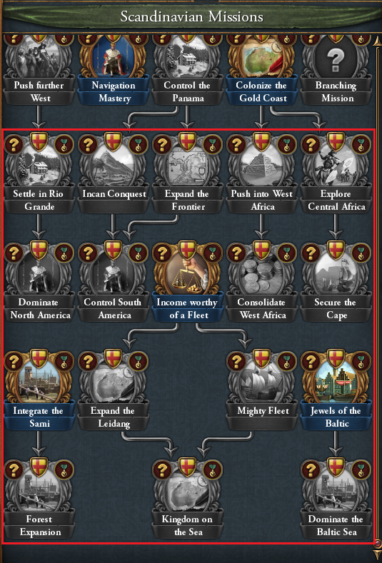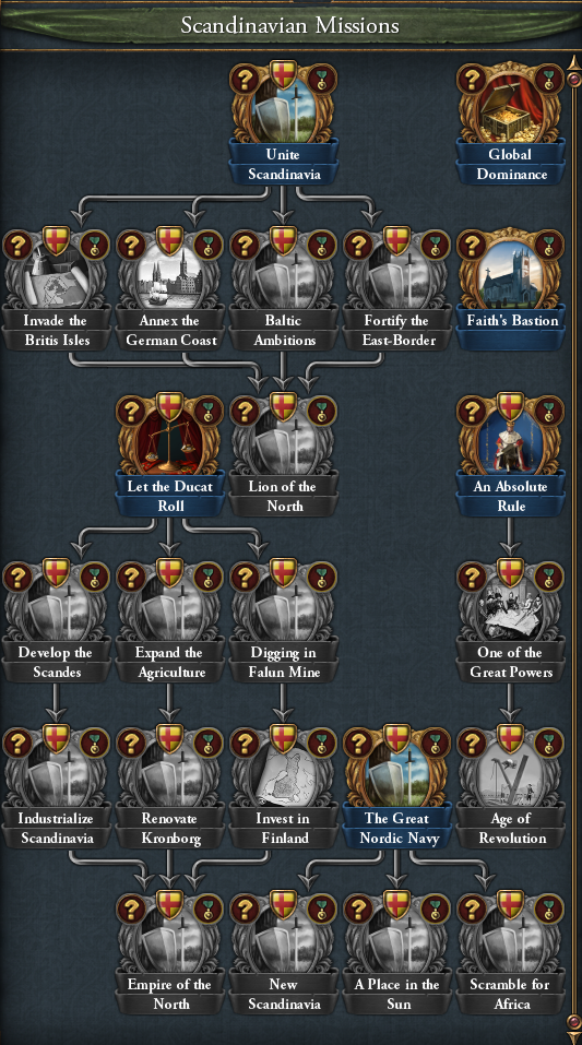 The Scandinavian mission tree was mostly inspired by the Germany mission tree as both formables are late game “what if” nations in EU4. Because of that the mission tree is split into 4 branches: