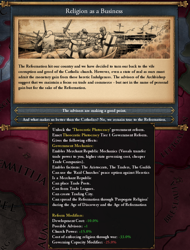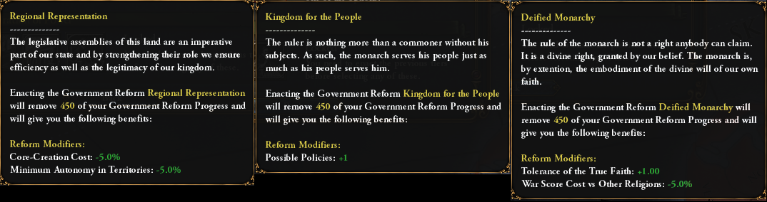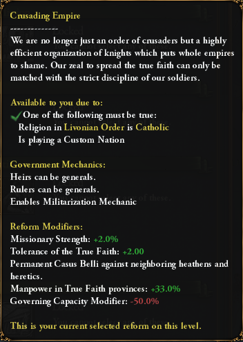 The second column focuses on handling the Reformation while the middle one allows you to reform your knights and militarize them even further as they were. As the reward of the final mission you unlock the following government reform: