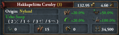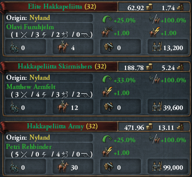 Meanwhile, the cavalry requires you to have the Hakkapeliitta in action for 5 years as well as either having 20% Cavalry Combat Ability OR 50 cavalry in total, and having at least 10 Finnish provinces with 10 development and a barracks.