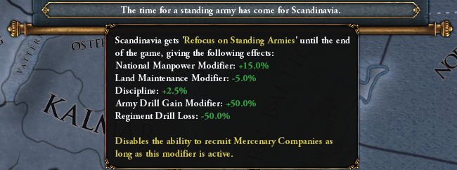 Finally, the mission “The Military Question” is the finisher for the mercenaries of Denmark. By having a completed Military idea group, 30% Army Professionalism, 40% Army Tradition and a level 3 Military Advisor you can fulfill this mission and trigger the following event: