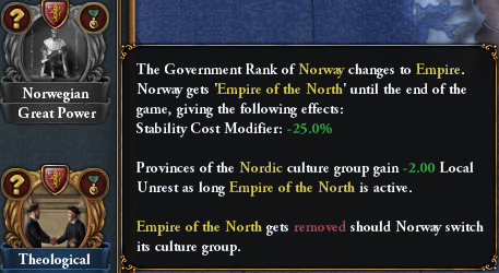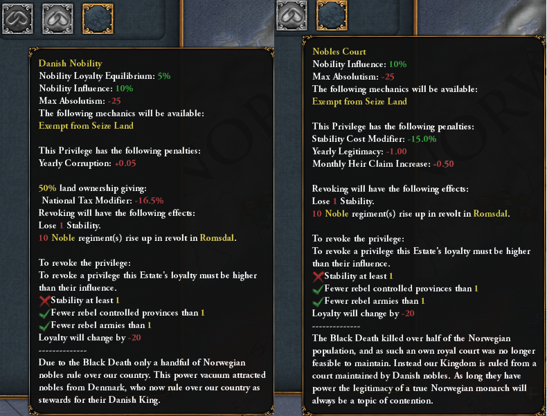 Note: while these privileges are active the Norwegian AI is more inclined to accept the Danish King as their monarch during the Kalmar Succession events.