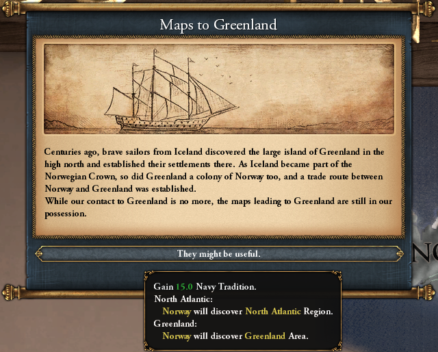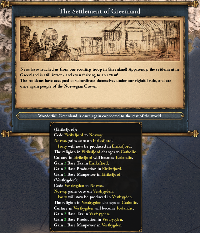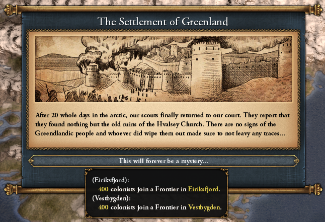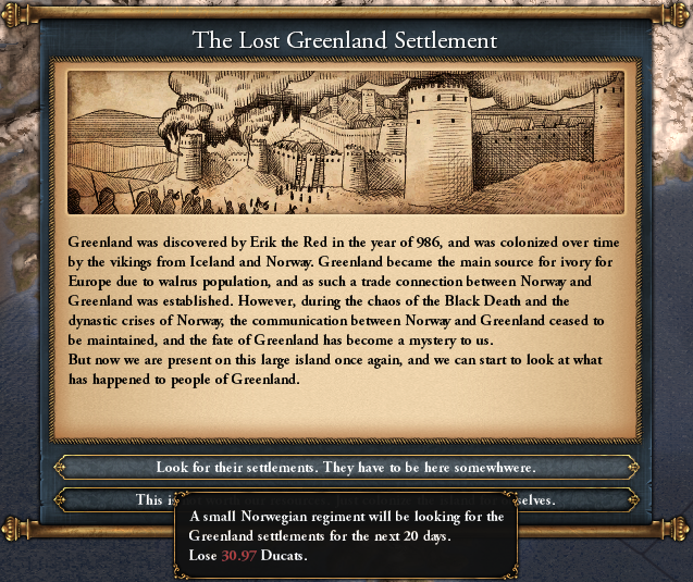 Speaking of Greenland, the mission “The Colony of Greenland” will require you to send troops to Greenland in order to see what happened to the former viking colony. Historically, the last written record of the Nordic Greenlanders documents a marriage in 1408. After that there was no contact with the people living there anymore.