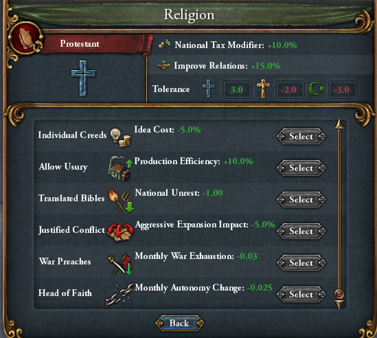 Next is Reformed, which has received a more boring but direct buff to their fervors as they were rarely - if ever - picked by any nation; and this even before the buffs to Catholicisim. As such the following buffs were given:
