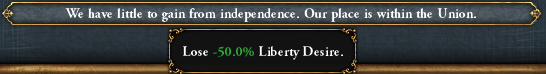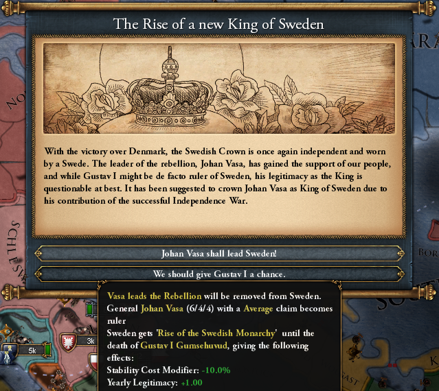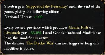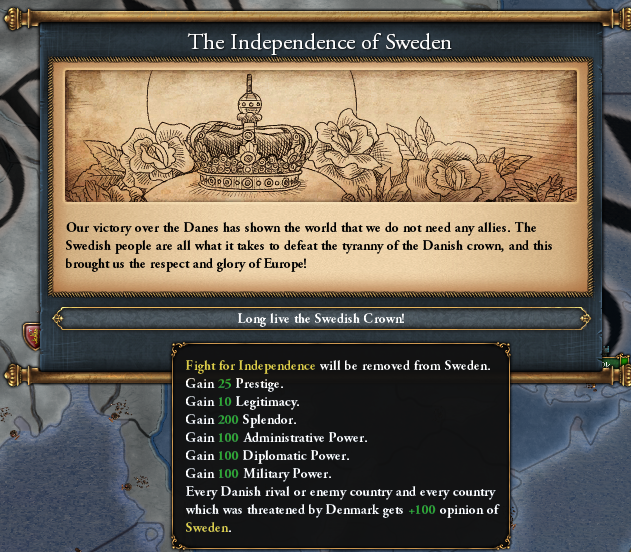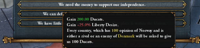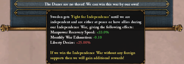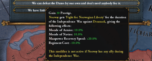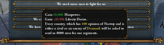 “Liberty for Norway!” will restore the stability loss and get you 30 Legitimacy while “Win Our Independence!” grants you a Restoration of Union cb against Denmark, allowing you to reverse the historical roles of Denmark and Sweden.