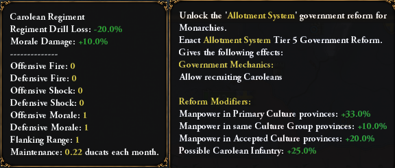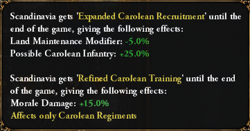 Additionally, we reduced the number of development required to recruit a Carolean unit. Now you can recruit one regiment of Caroleans for every 10 development of Swedish or Finnish provinces.