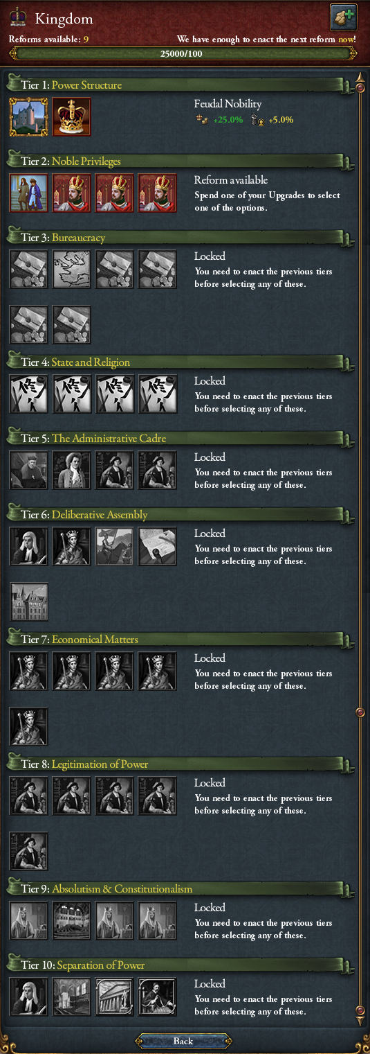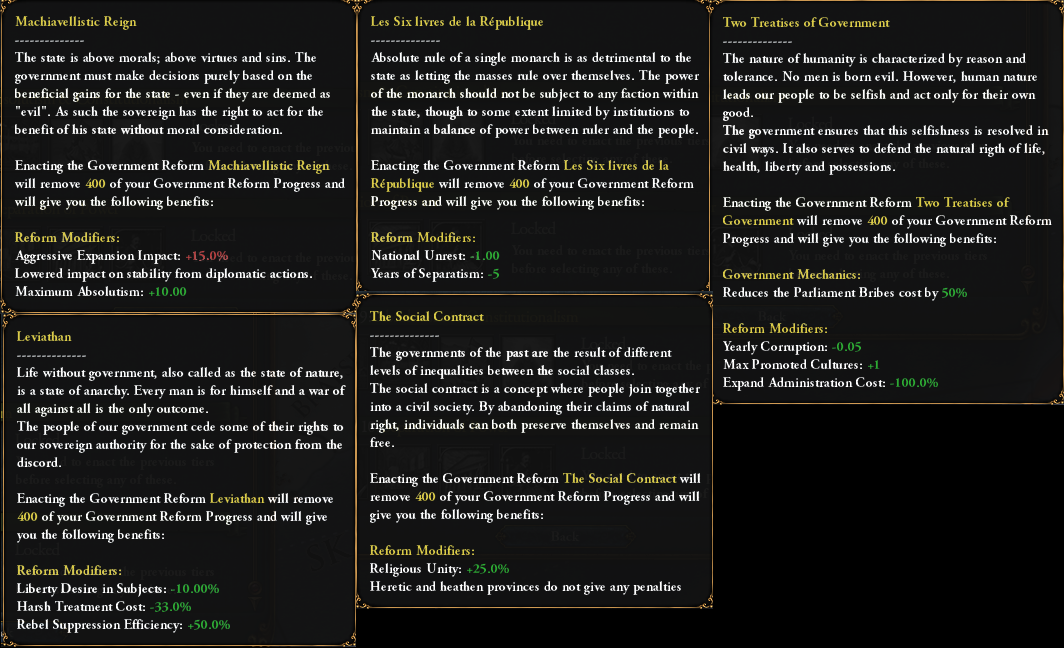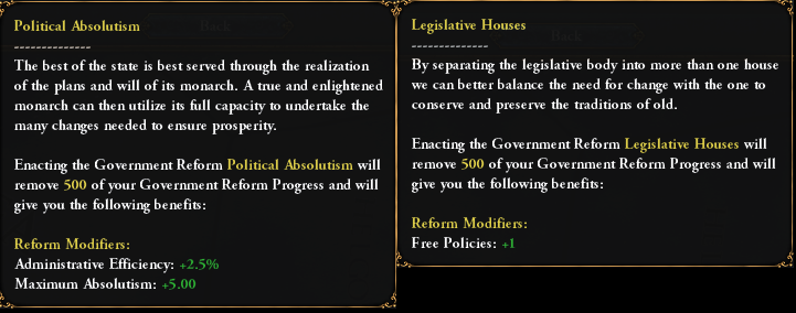 Many of the new reforms and changes to old reforms adjusted absolutism for monarchies which was not a very popular approach whatsoever. Because of that we have decided to drop this idea entirely. We also did some rebalancing of the tiers. Here is the new update of the monarchy reforms: