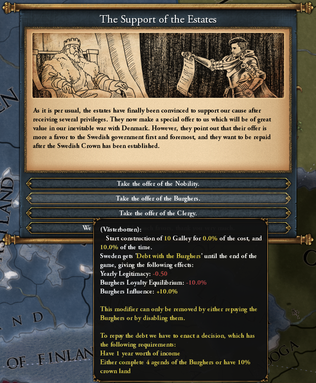 Note: We did and still do consider adding the Indian estates as a reward too for the “Crown of India” mission. Due to problems with the UI (the estate window would require a rework to be able to show more than 5 estates + crownland at the same time) as well as the issues of immersion (all the Dharma estate events will assume you are an Indian nation, not a Scandinavian foreign power which happens to own India) we are hesitant to add this reward though.