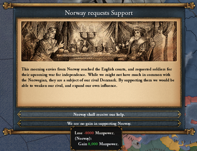Starting with the independence missions, the mission “Norwegian Allies” can be completed by having two rivals or enemies of Denmark have 100 opinion of Norway. As a reward you can request their support through the following event: