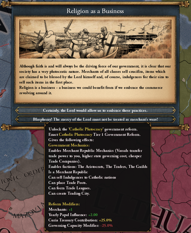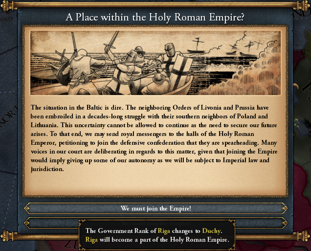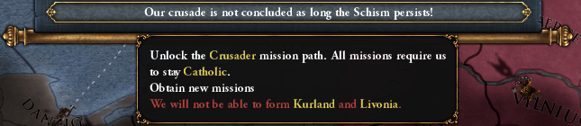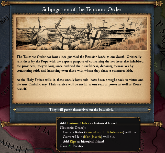 Completing the mission “The Order and the Empire” will grant you yet another choice of what path you want to follow: If you take either of the two HRE paths (Holy Roman Diplomacy and German Conquest) and the Emperor forbid you to declare wars on HRE members until you become Prussia, you will get the following event: You will form a Catholic Prussia within the borders of the HRE, becoming a Teutonic Bishopric, a new government reform for a Catholic Theocratic Prussia.