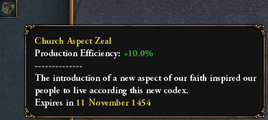 Additionally, we are also experimenting with a way to make swapping church aspects actually worth your time. Whenever you select a new Church Aspect you gain a passive modifier for 10 years which increase the effectiveness in of the Church Aspect: