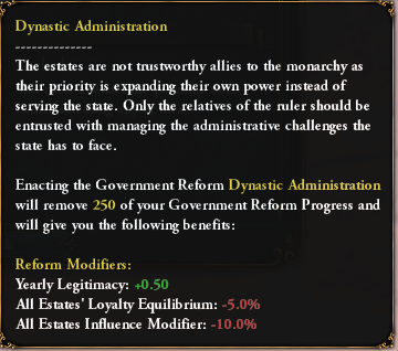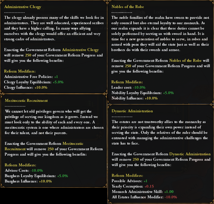 Note: Only the “Dynastic Administration” is new here. The other three reforms are untouched from the current version.