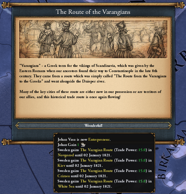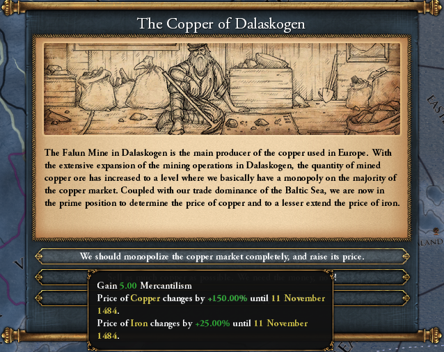 A branch about the internal development of your country. Unlike the other branches, this one has the more interesting rewards and requirements. Through “Let the Ducat Roll” you unlock the Mountain and Forest Expansion privileges. “Invest in Finland” unlocks the Hakkapeliitta mercenaries for your country, “Develop the Scandes” fires the Norwegian event chain for the copper and iron in Scandinavia. And “Empire of the North” gives permanently +5% Development Efficiency.