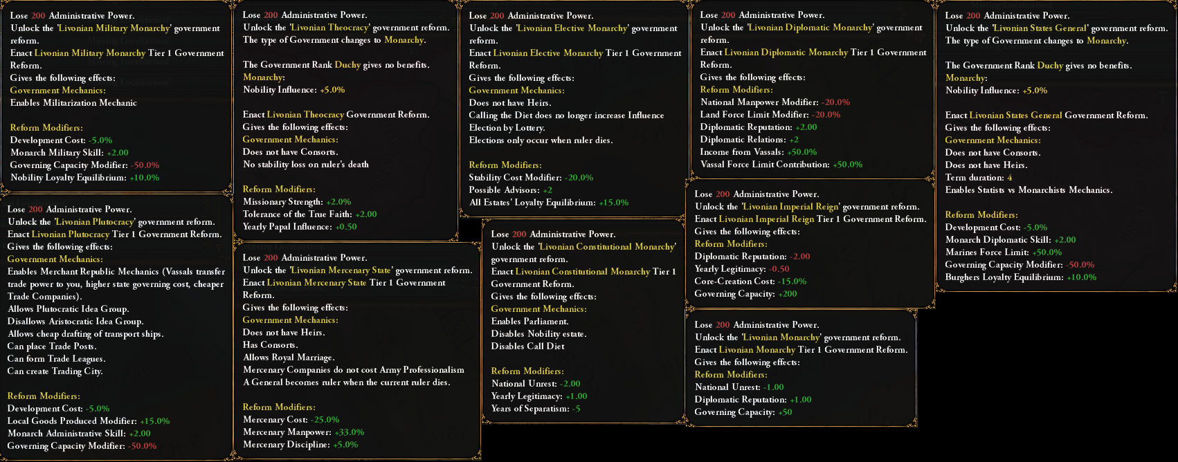 Right now there are 10 final governments you can get: one default “Livonian Monarchy” and nice specialized reforms based on your decisions from the 6 events. Here is a short overview of them: