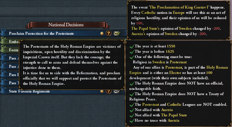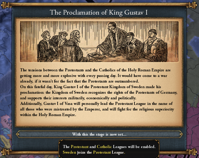 The missions started with “Handle the Empire” are Swedish specific as they are a continuation of Gustavus Adolphus’ ambitions in Germany. Either through conquest or diplomacy, the goal of these missions is to dominate the Holy Roman Empire. The great payoff of uniting Germany is the following reward:
