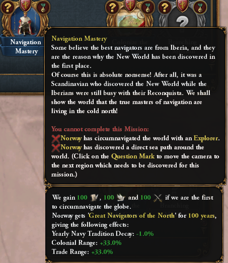 The missions of Norway are split into three themes: gain independence from Denmark and place your own Monarch on the Danish throne, Colonization and internal missions.