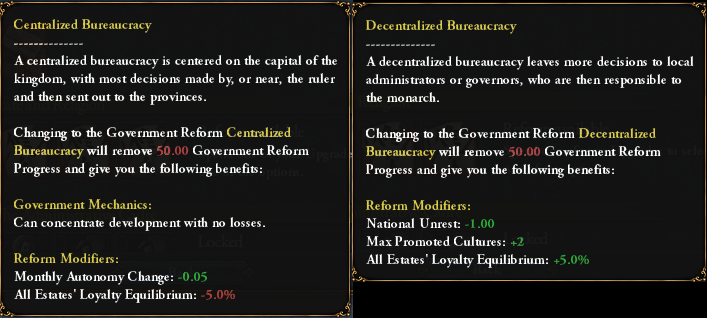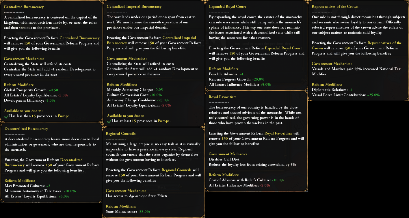 Note: The requirements of the Centralized Bureaucracy reforms scales with the ages. With every age the range of the requirements increases by 10 (for example: Centralized Imperial Bureaucracy would require 35 provinces in the Age of Absolutism to be visible while during the Age of Discovery it would be only 15 provinces).