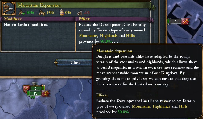 The trade missions on the most left side of the mission tree are about completing Burgher Agendas, construct markets and, of course, dominating the trade of the North Sea and Lübeck. Highlights here are the permanent +20% Loyalty Bonus for Burghers with the mission “Monopolize the North Sea” and the new Burgher Estate privilege “Mountain Expansion” from the mission “Please the Burghers”.