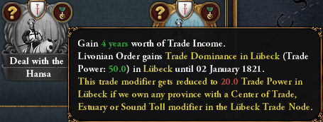 Continuing with the mission tree, the middle column handles the mentioned issue of no gain from New World trade. With the mission “Deal with the Hansa”, which requires you to defeat Lübeck, you gain the following reward: