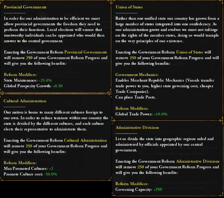 You always have three options to pick from: the first one lets you focus on a more concentrated and focused government which is suited for tall players, while the last option is for expansionists, though these government reforms have their own sets of drawbacks. The middle option is the more balanced of the two, but this will reflect in your government reform too.