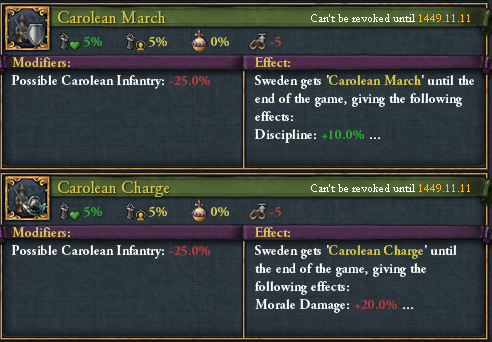 The missions “Refine the Caroleans” and “Incorporate the Cavalry” revolve around the Carolean and the Hakkapeliitta. With the former mission you need to specialize even further into your military by reaching 20% Discipline OR gain 14 Military Power per month, have 25 Swedish or Finnish provinces with a barracks and at least 75% Army Professionalism. As a reward you get the following effect: