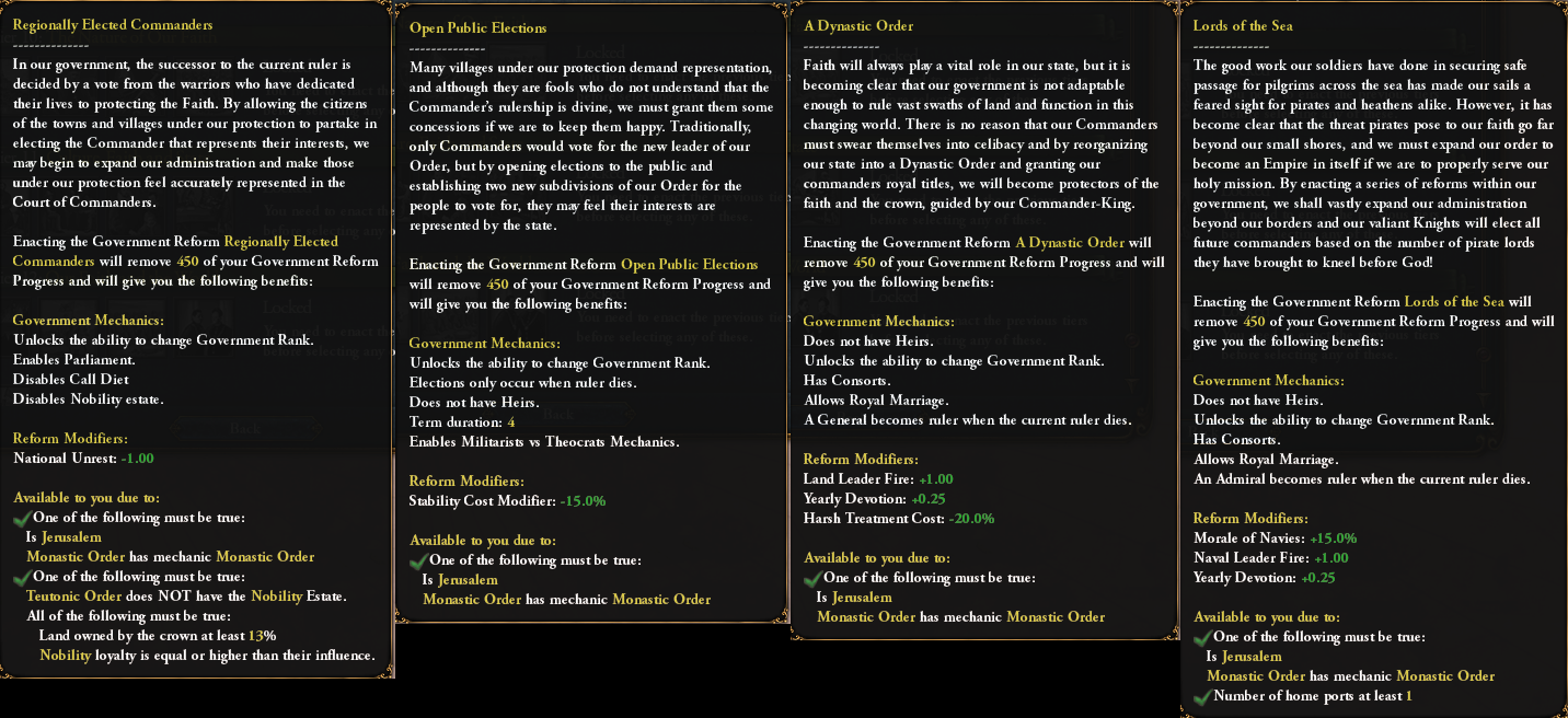 Governments which have the “Is a Monastic Order” government trait gain access to four additional reforms which are already part of the game right now.