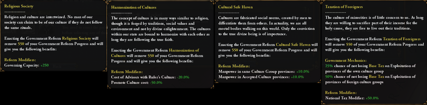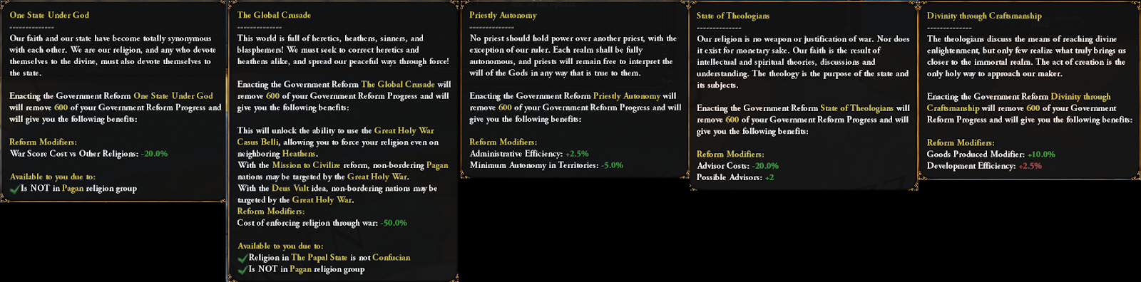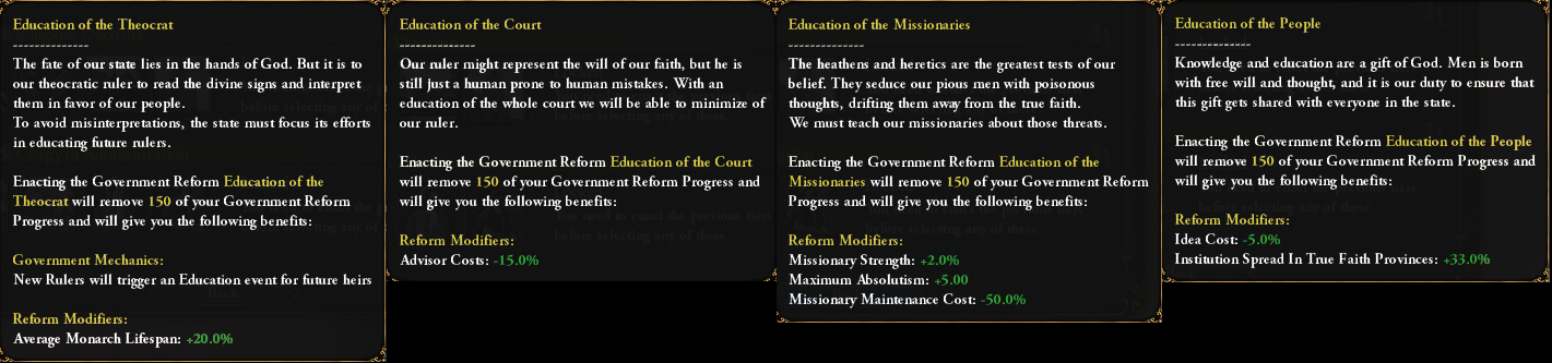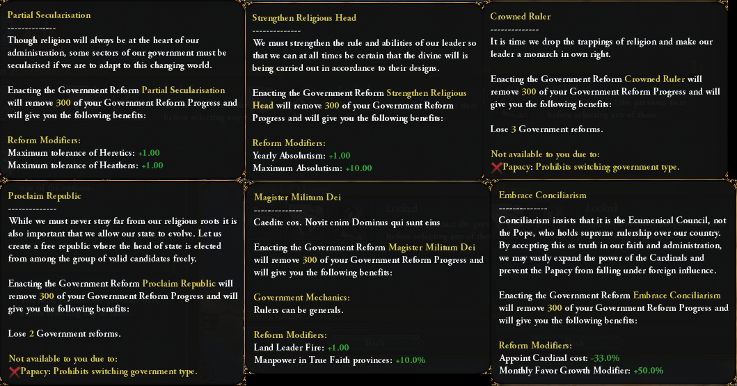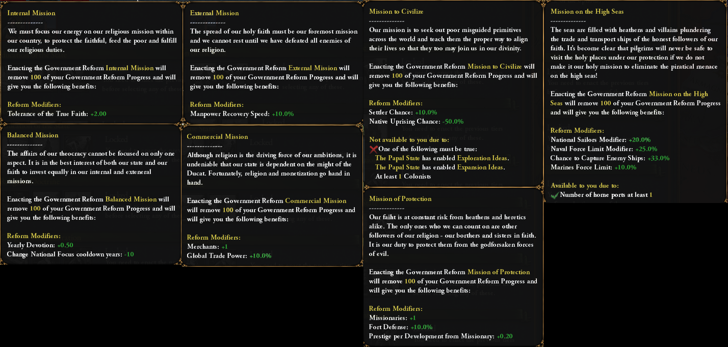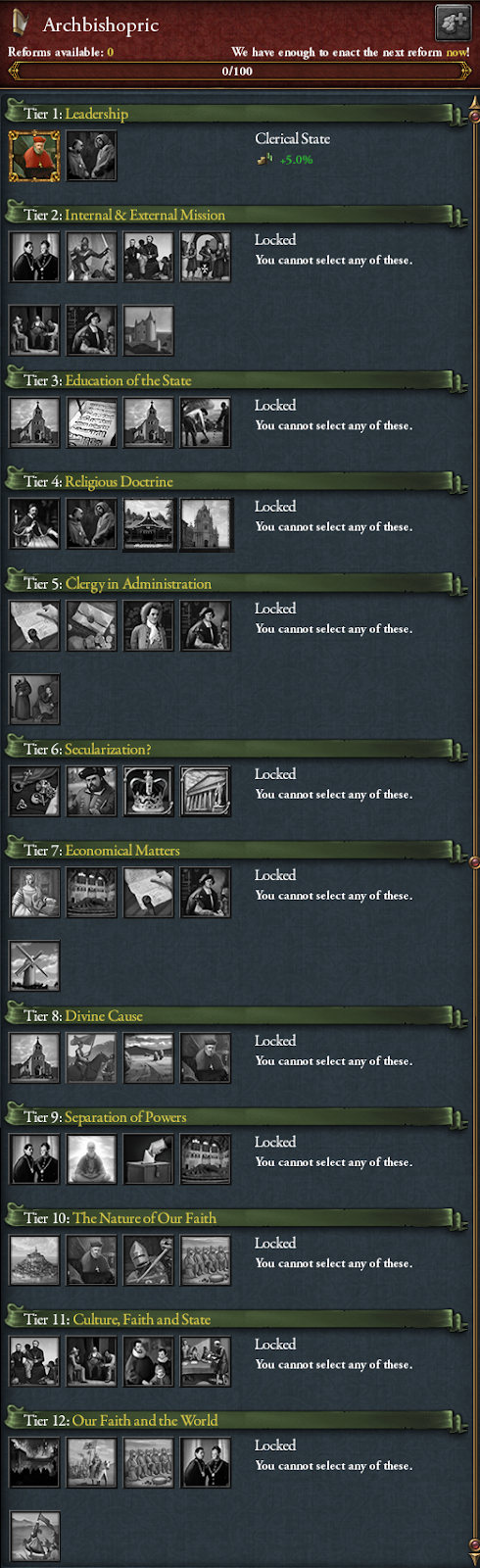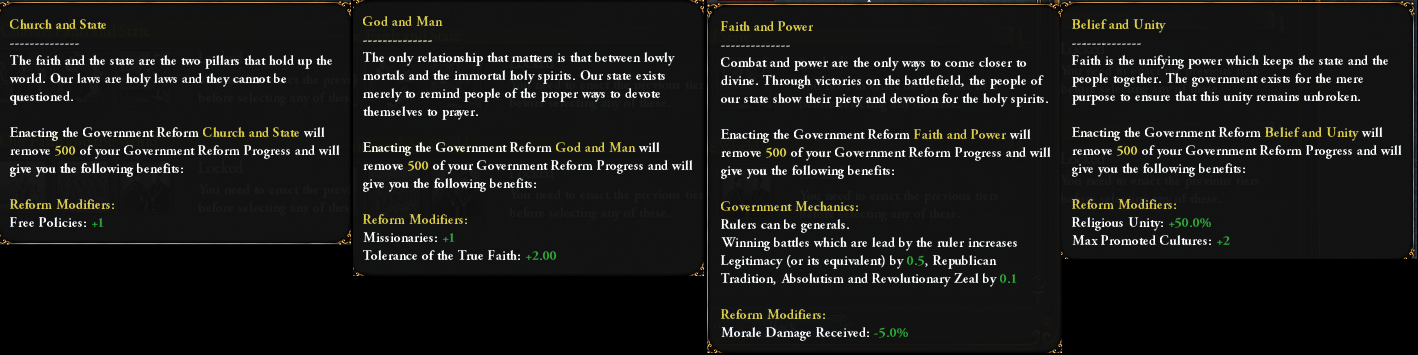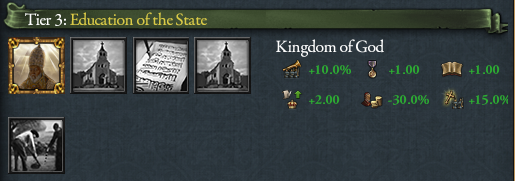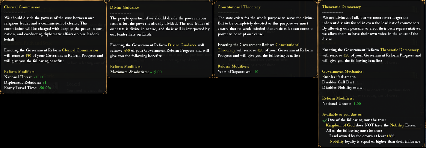 While we are at it: the Kingdom of God reform for the Papal State is still in the 3rd tier, but has received some buffs to make it more on par with theocracies which have access to the Papal Influence and Education of the Theocrat: