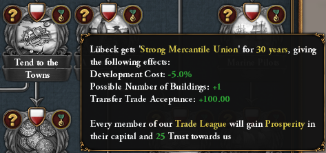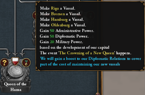 To wrap up the flavor part of the tree, declaring the Queen of the Hansa mission will turn all members of your trade League into subjects and grant a diplomatic relations modifier to cover part of the upkeep costs for 30 years. Furthermore, you will gain monarch power scaled to the Development of your capital, 10 points per development to be precise: