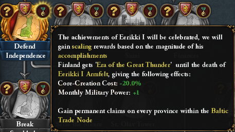 The mission Defend Independence will require you to make allies, raise your stability and bring balance to your financial affairs by having no loans. As a reward, you will be able to write your own story, your saga, which will grant you a scaling reward based on your ruler’s achievements during his lifetime at the time of completing the mission. The factors for the reward are: