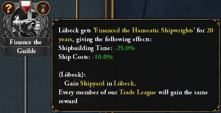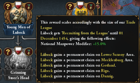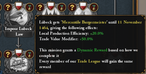 Impose Lübeck Law will grant another dynamic reward, based on which faction is in power at the time of completion: