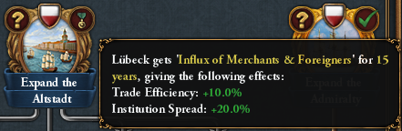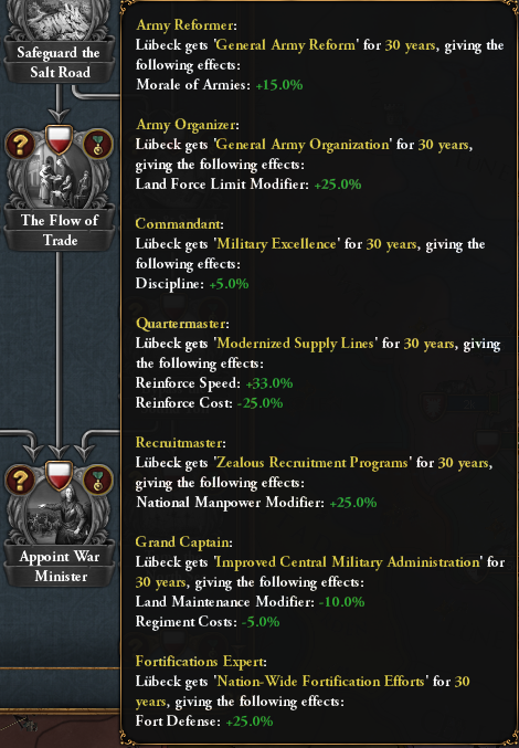 The second part of the tree is wholly dedicated to the internal affairs of both Lübeck itself and the Hansa as a general league of trade nations. Initially, you will have to expand the Old City of Lübeck and its market, yielding powerful Trade Efficiency and Institution Spread modifiers for a few years followed by the Peace of Vordingborg, imitating the styles of Italian Bookkeeping and Financing the Guilds of Lübeck: